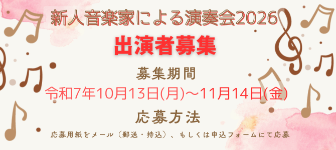 募集【募集】新人音楽家による演奏会2026 出演者募集 ~14日(金)まで! [2025/10/01]